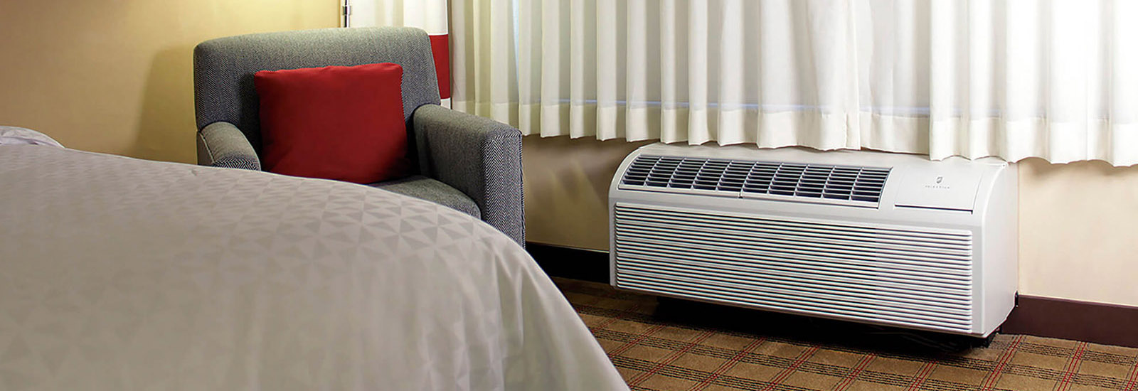 A Packaged Terminal Air Conditioner (often abbreviated PTAC) is a type of self-contained heating and air conditioning system commonly found in hotels, motels, senior housing facilities, hospitals, condominiums, apartment buildings, add-on rooms & sunrooms.